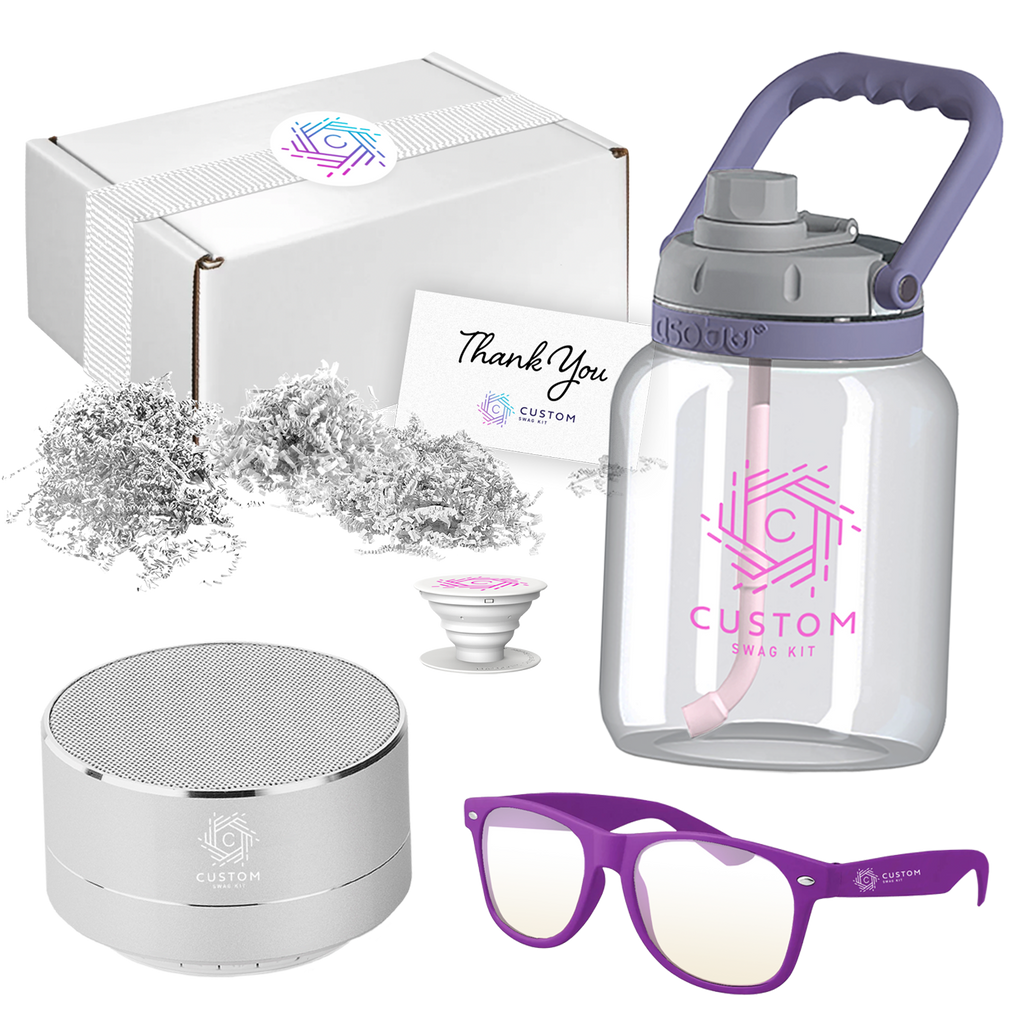 The Bass-ic Kit includes our Goldie Wireless Speaker, the amazing 33 oz Asobu Juggler bottle, a PopSockets PopGrip, and the Blue Light Blocking Retro Promotions Glasses.